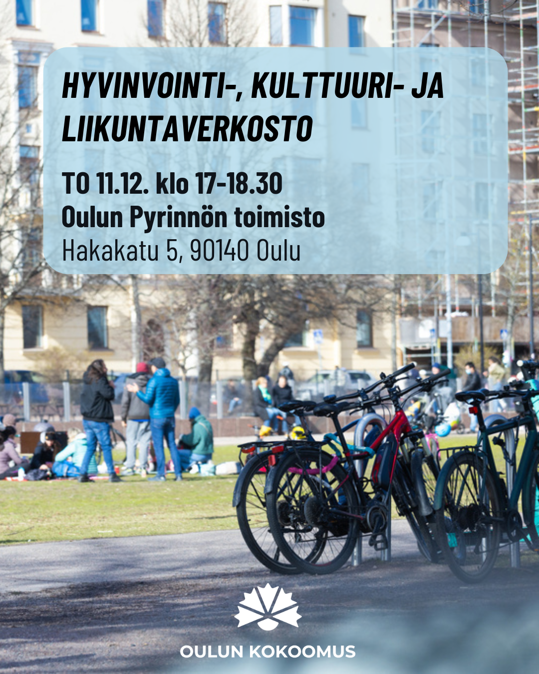 Hyvinvointi-, kulttuuri ja liikuntaverkoston seuraava tapaaminen Oulun Pyrinnön toimistolla. Tilaisuuden alustajana toimii Oulun Pyrintö ry:n toiminnanjohtaja Hanna Uusitalo. Paikka: Oulun Pyrinnön…