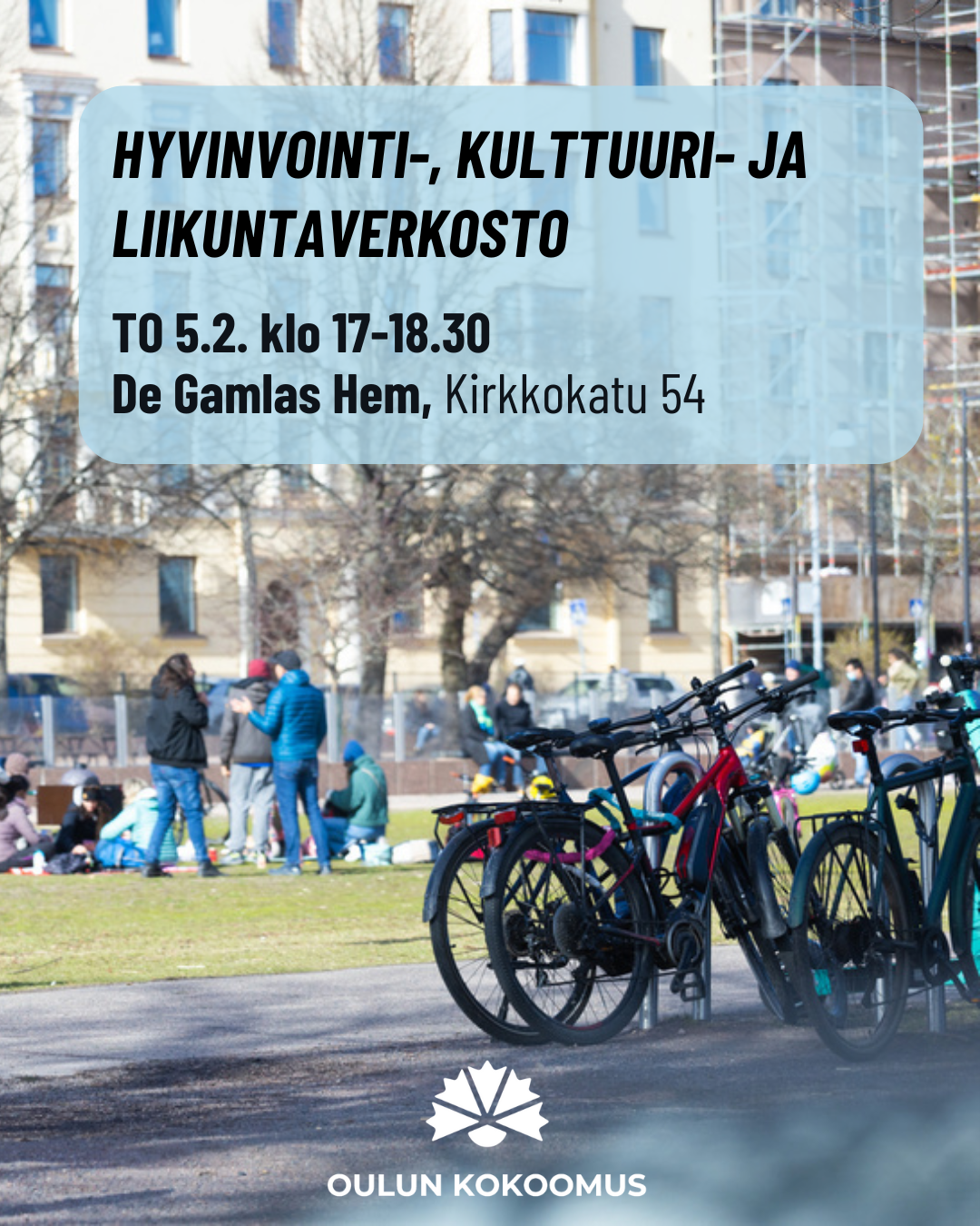 Oulun Kokoomuksen hyvinvointi-, kulttuuri- ja liikuntaverkoston seuraava tapaaminen torstaina 5.2. klo 17.00–18.30. Aiheena on palveluverkkouudistus, painopisteenä kulttuurin ja liikunnan…