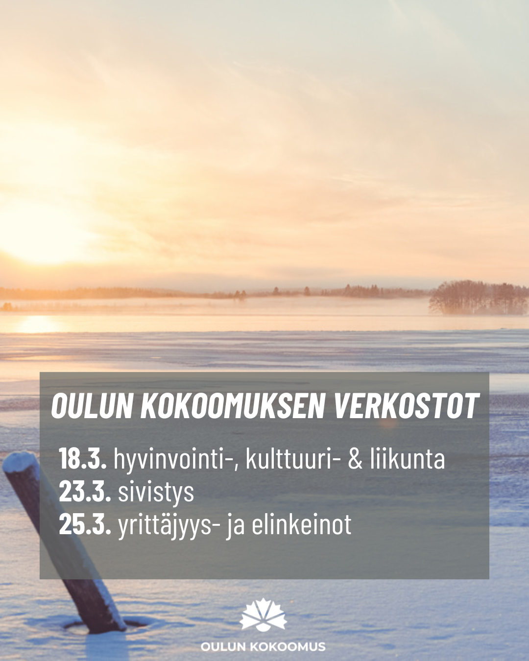 Oulun Kokoomus on hoitanut oululaisten asioita jo vuosikymmenten ajan. Maailma on muuttunut ja asiat tulleet entistä monimutkaisemmiksi ja vaikeammiksi, mutta arvomme, periaatteemme ja tavoitteemme ovat pysyneet ennallaan. Haluamme turvata oululaisille mahdollisimman hyvän ja sujuvan arjen. Haluamme vahvistaa jokaisen oululaisen hyvinvointia ja koko Oulun elinvoimaa.