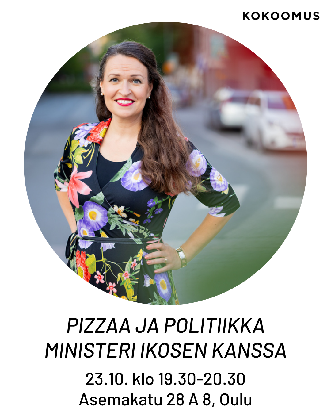 Tule viettämään rento ilta pizzan ja politiikan parissa. Tilaisuudessa mukana kunta- ja alueministeri Anna-Kaisa Ikonen, joka tulee kertomaan ajankohtaisista aiheista sekä kuulemaan osallistujien näkemyksiä ja kysymyksiä.