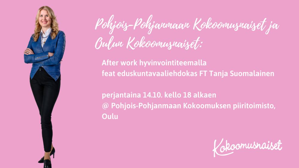 LÀmpimÀsti tervetuloa Pohjois-Pohjanmaan Kokoomusnaisten ja Oulun Kokoomusnaisten yhteisille after workeille. Tilaisuus jÀrjestetÀÀn hyvinvointiteemalla, ja tilaisuuteen saapuu Oulun Kokoomusnaisten oma eduskuntavaaliehdokas FT Tanja Suomalainen!