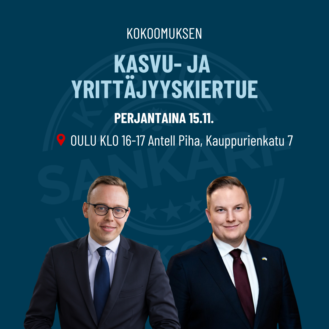 Tervetuloa Kokoomuksen eduskuntaryhmän kasvu- ja yrittäjyyskiertueen tilaisuuteen Oulussa pe 15.11. klo 16-17.