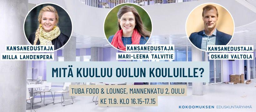 Eduskunnan sivistysvaliokunnan Oulun vierailun yhteyteen kokoomuksen kansanedustajat Mari-Leena Talvitie, Milla Lahdenperä ja Oskari Valtola järjestävät keskustelutilaisuuden koulutusasioista Tuba Food & Loungessa!